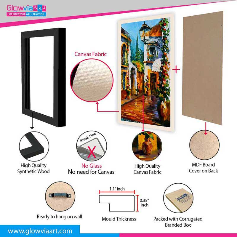 • Frame: A pinewood frame is used for the stretched canvas & photo frames are made from high-quality synthetic wood.